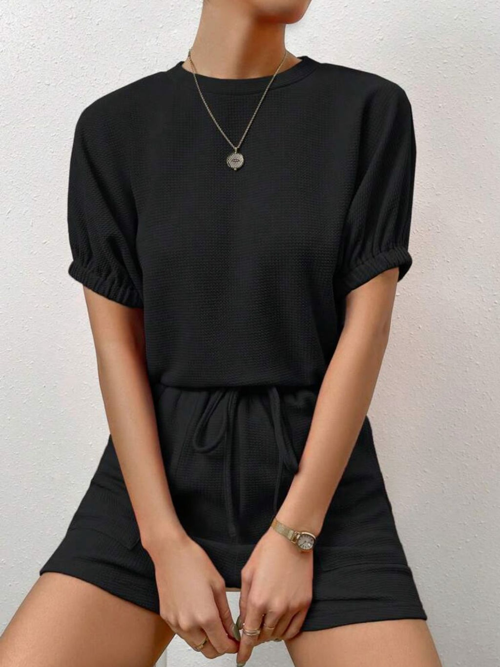 Waffle-Knit Round Neck T-Shirt and Pocketed Shorts Lounge Set